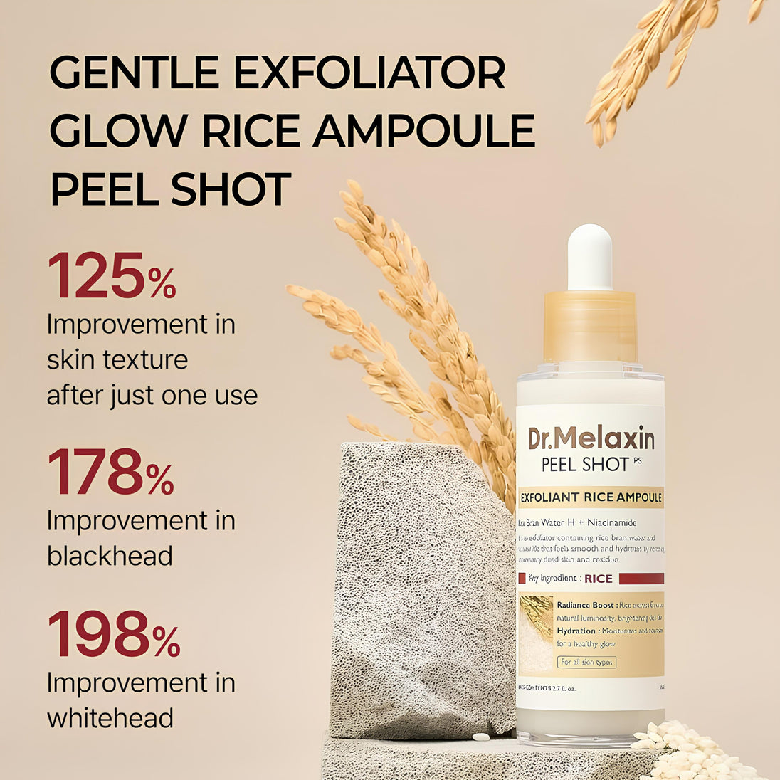 The Dr.Melaxin Peel Shot Glow White Rice Peeling Ampoule combines gentle exfoliation with deep hydration to refine skin texture and visibly enhance radiance. Formulated with rice bran water, niacinamide, and a balanced blend of AHA, BHA & PHA, it helps remove dead skin cells, unclog pores, and support a clearer, more even-looking complexion — without stripping the skin.