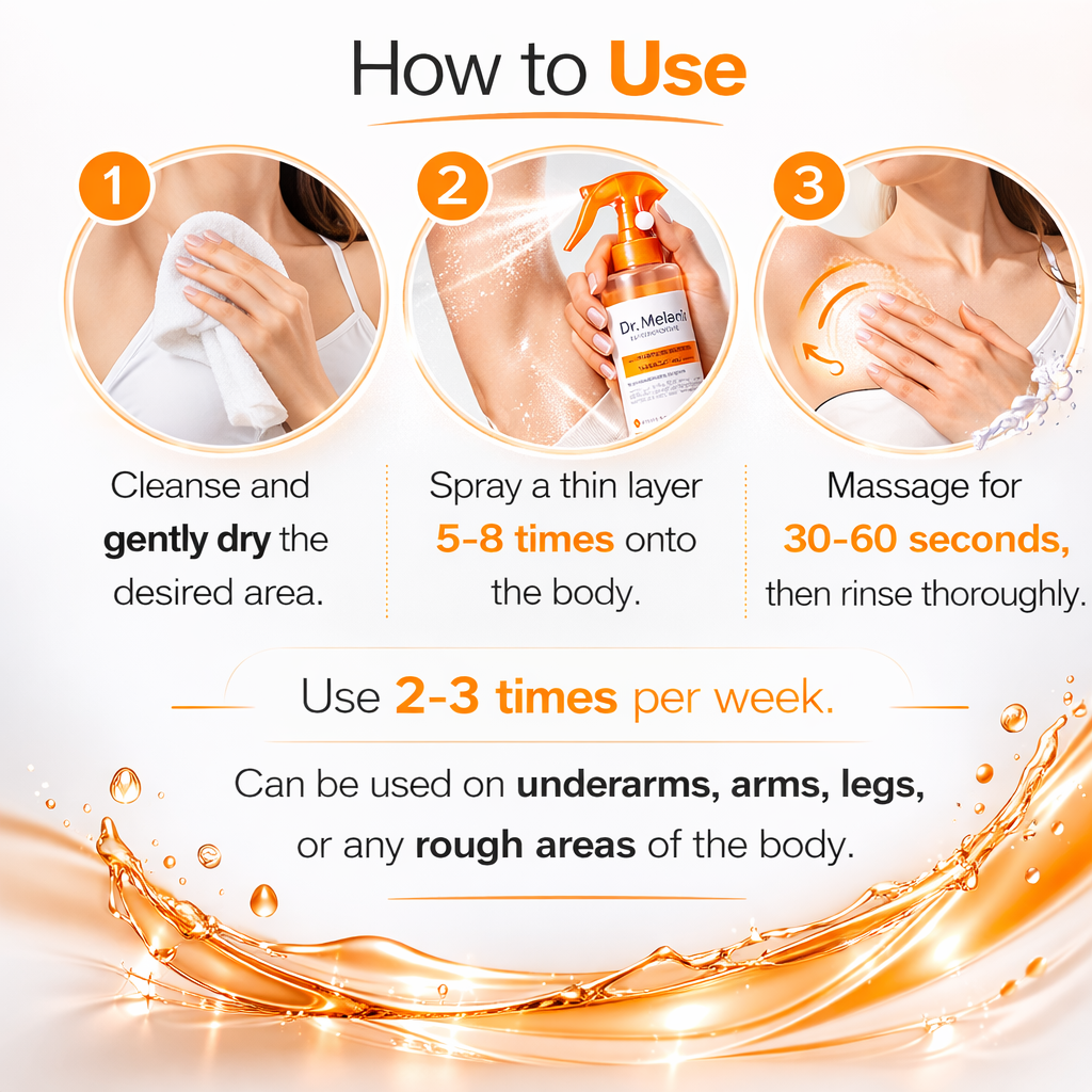 Spray or apply onto dry skin, gently massage to exfoliate, then rinse. Use as part of your routine 1–3 times a week depending on skin sensitivity.