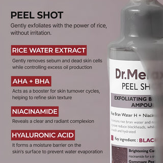 The Dr.Melaxin Peel Shot Exfoliating Black Rice Ampoule is designed to deeply cleanse pores, remove stubborn blackheads, and boost radiance while maintaining hydration. Formulated with rice bran water, niacinamide, and a complex of AHA, BHA & PHA acids, it helps dissolve dead skin buildup and balance excess sebum for a refined, radiant-looking complexion.