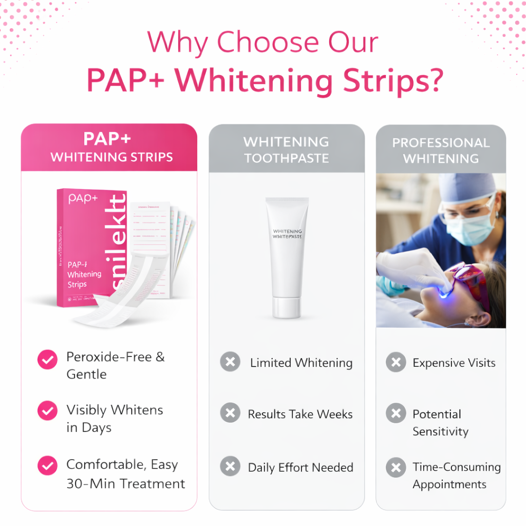 Daily habits like coffee, tea, and wine can stain your teeth, making your smile look dull. Many whitening products use peroxide, often causing sensitivity.