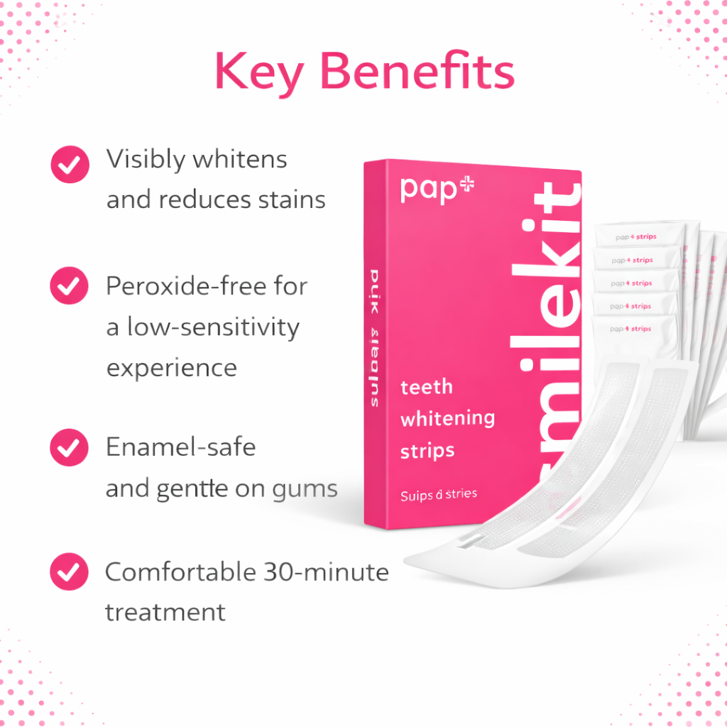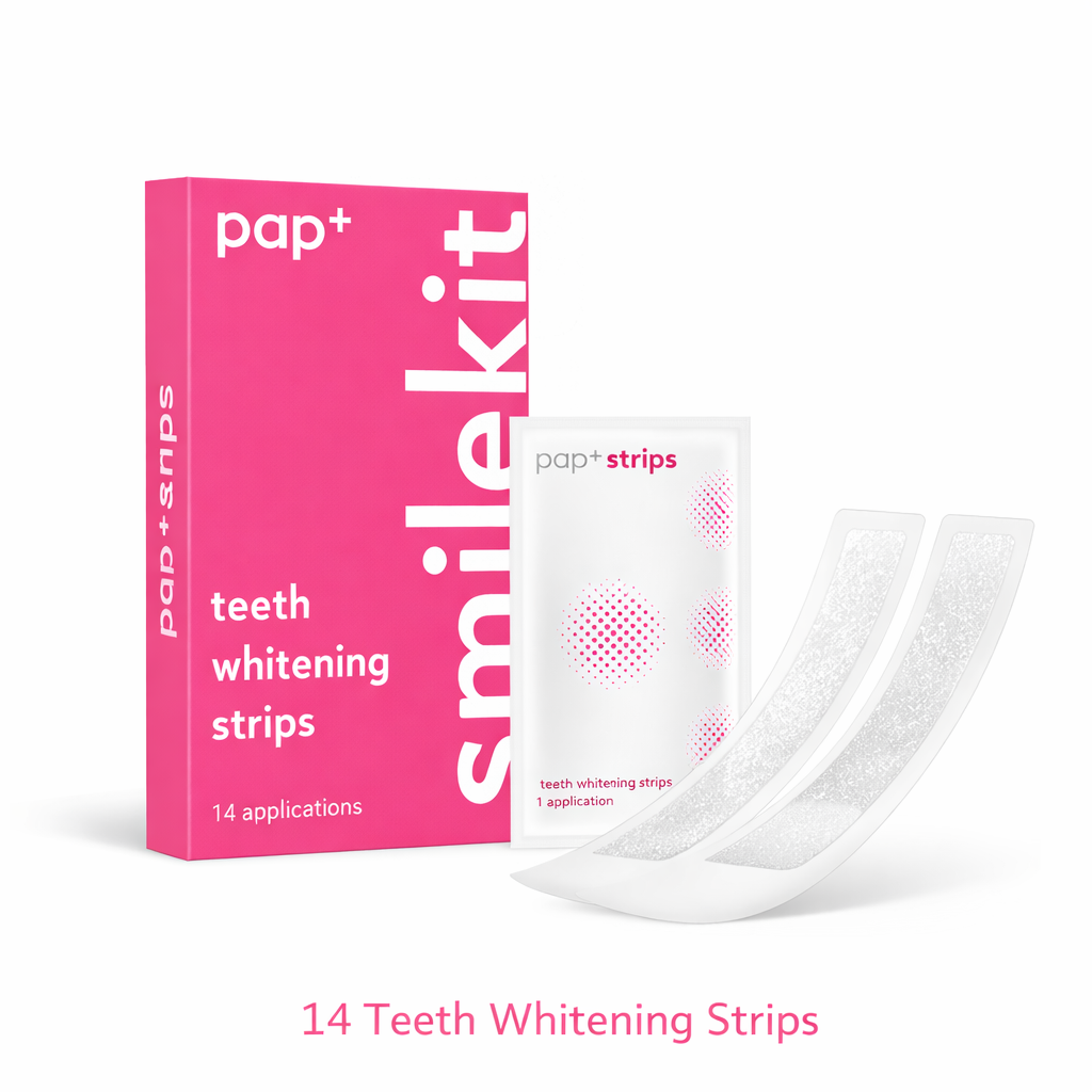 PAP+ Whitening Strips feature a peroxide-free formula that gently lifts stains and visibly brightens your smile — delivering comfortable, at-home whitening in just 30 minutes.